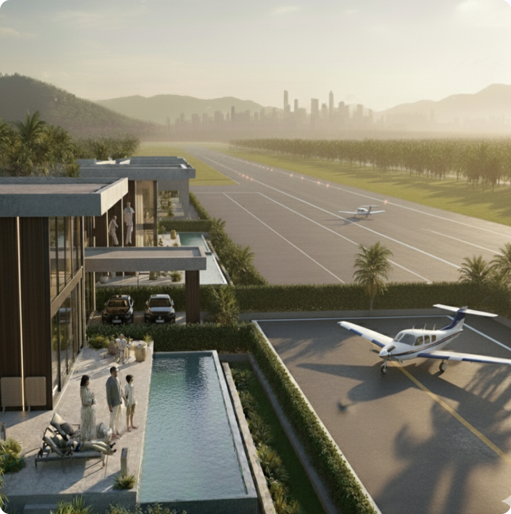 100 hangar villas moving off-plan, hospitality pipeline, zero debt on core assets. Asia’s fastest-growing aviation real estate play.